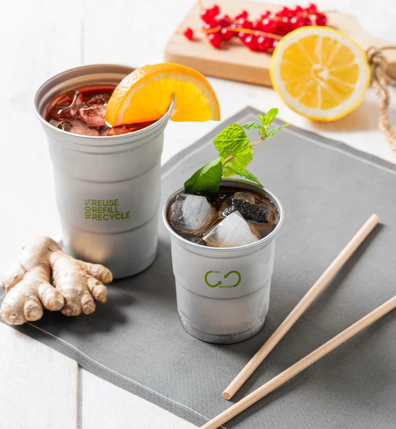 Abbiamo introdotto un nuovo bicchiere interamente realizzato in alluminio. Una scelta che unisce design e sostenibilità. 100% Reuse, Refill, Recycle: un nuovo modo di gustare il tuo drink.